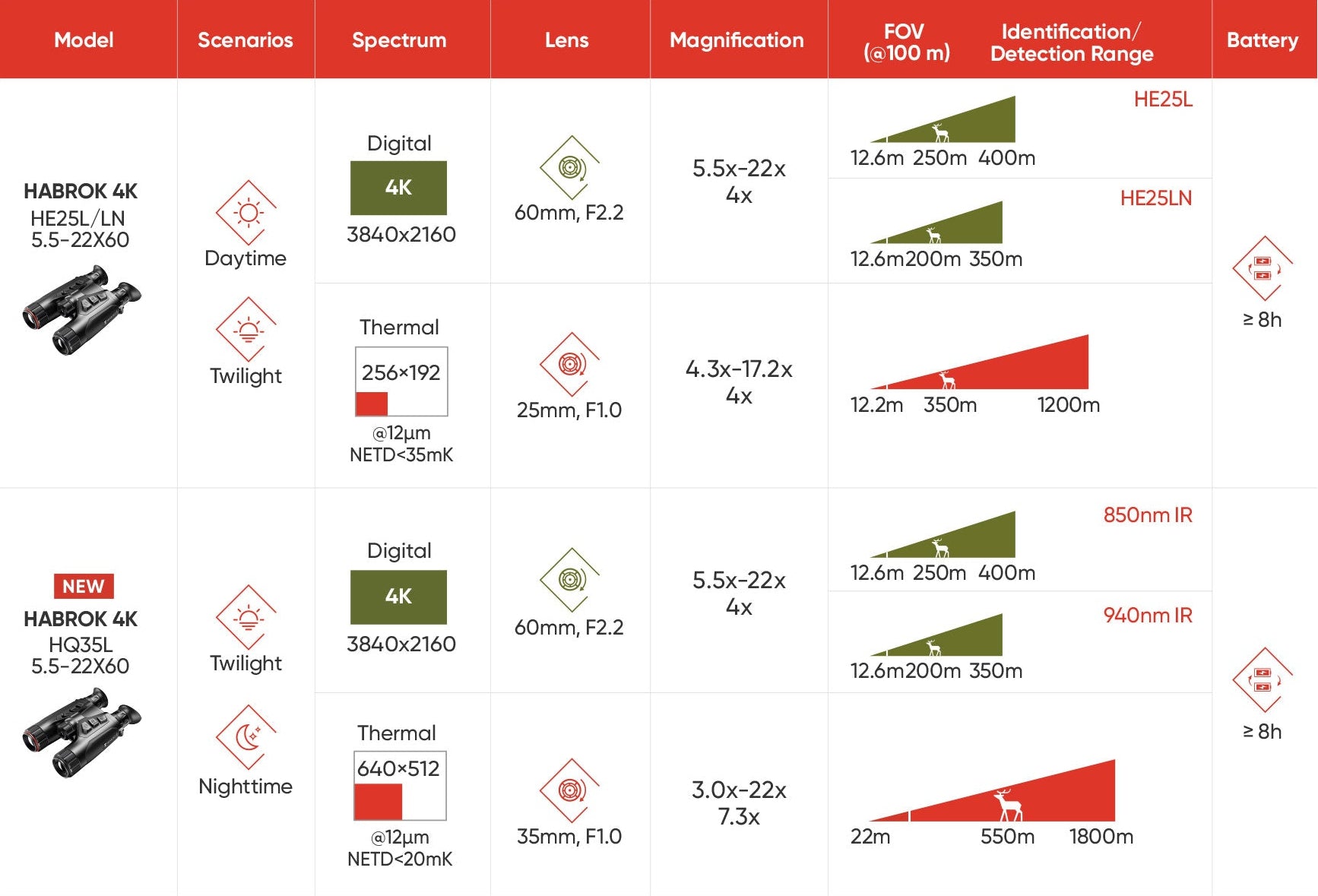 Als Multispektrum-Fernglas bietet die Wärmebildkamera des HABROK 4K die Möglichkeit, durch die Tarnung von Tieren zu sehen und das Wärmesignal des Tieres auch dann zu präsentieren, wenn es sich zwischen Büschen oder Blättern befindet. Dies ermöglicht ein schnelles Scannen und eine effiziente Suche in der offenen Wildnis. Darüber hinaus kann HABROK 4K mit einer Wärmebildkamera mit bis zu 640x512 und 20mK sowohl das Wild als auch die Umgebung erfassen, ohne dass Details verloren gehen.