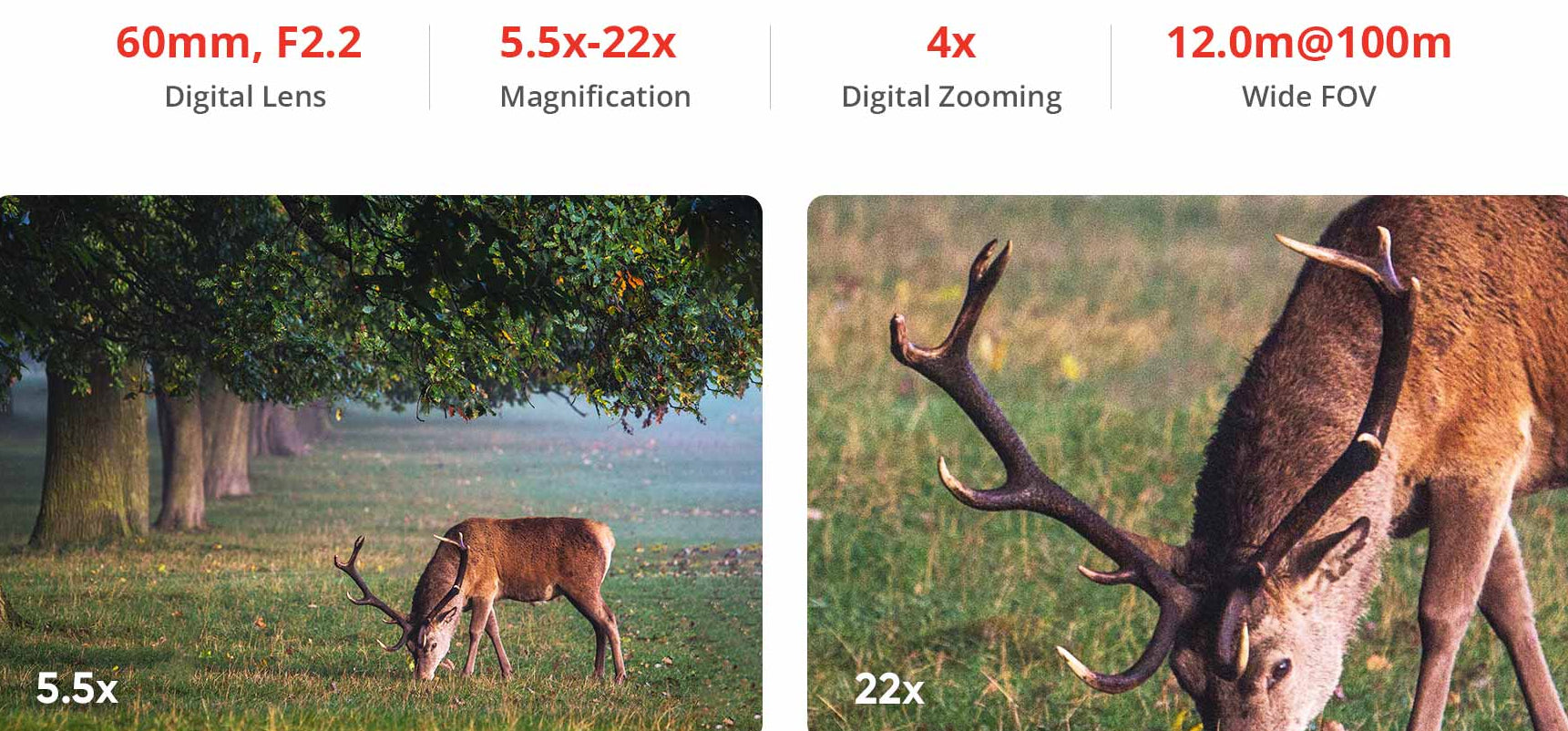 Anstatt einer feststehenden Vergrößerung mit einem optischen Fernglas erlaubt die 5,5- bis 22-fache Vergrößerung mit einer Brennweite von 60 mm, dass Sie mit der HABROK 4K frei zoomen können, von der Erfassung der ganzen Umgebung bis zur Wahrnehmung kleinster Details, wie z. B. dem Geweih eines Rehs, oder von Geschlechtsmerkmalen, bis zu 150 m bei Tageslicht